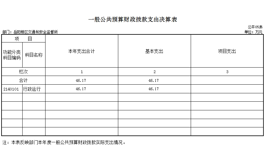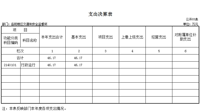 岳阳楼区交通和安全监督所2016年总的收支决算46.17万元,2016年本单位4月份新成立,与2015年无对比性。