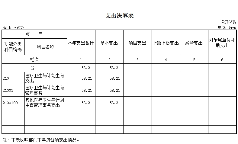 本年度总支出为58.21万元,其中基本支出为36万元,占比61.8%;项目支出为22.2万元,占比38.1%。