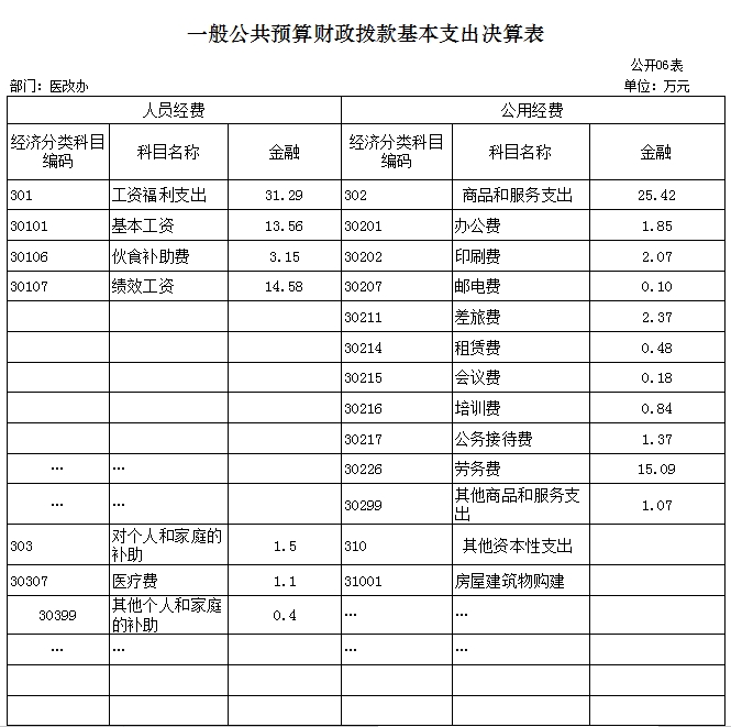 本年度医改办财政补助支出年初预算为54.51万元,支出决算为58.21万元,完成年初预算的106%,决算大于预算数的主要原因为:①、工资制度改革,工资福利支出增加1.8万元,增长6%;②商品服务支出25.42万元,较年初预算3.43万元比,增加21.99万元。