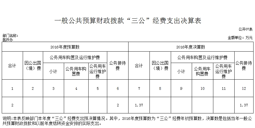 (1)医改办2016 年度“三公”经费财政拨款支出预算为2万元,支出决算1.37万元,完成预算的68.5%,主要是公务接待费。