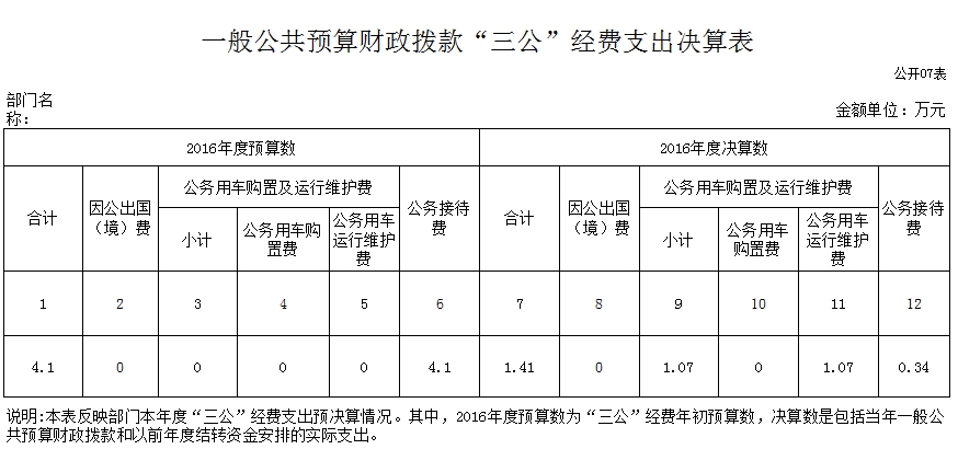 2016年度公共预算财政拨款安排的“三公经费”支出4.1万元,实际发生1.4114万元。