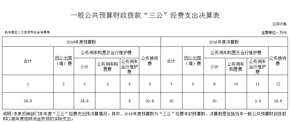 2016年严格按照绩效管理工作的要求、认真落实绩效管理办法及落实实施细则精神、确保三公经费合理、有效、公开。2016年全年预算(计划)24.90元,目前、2016年我局实际发生三公经费20万元、其中:公务用车运行费3.4万元、公务接待费16.6万元、我局三公经费使用严格按照预算不超支、无预算不开支的原则实施实行部门预算、对纳入考核的追加经费,按有关规定执行、逐步降低机关行政成本。