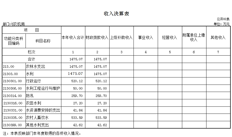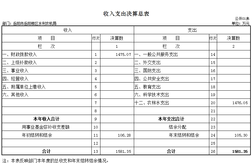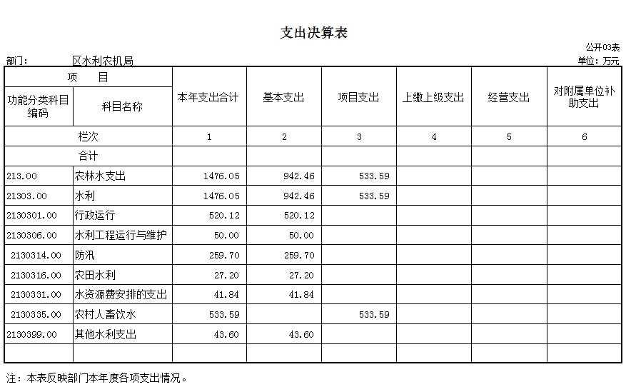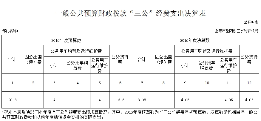 (一)2016年度,我单位年初结转和结余106.29万元,本年总收入1475.07万元,其中财政拨款收入行政运行520.12万元、水利工程运行与维护50万元、防汛259.7万元、农田水利27.2万元、水资源费安排的支出41.84万元、农村人畜饮水533.59万元、其他水利支出42.62万元;本年总支出1476.05万元,年末结转和结余105.31万元。基本支出942.46万元,其中行政运行520.12万元、水利工程运行与维护50万元、防汛259.7万元、农田水利27.2万元、水资源费安排的支出41.84万元、其他水利支出43.6万元,项目支出533.59万元。2016年三公经费预算20.3万元,实际支出8.08万元;其中公务接待4.03万元,公车运行4.05万元,三公经费实际使用数比预算数少支出12.22万元。