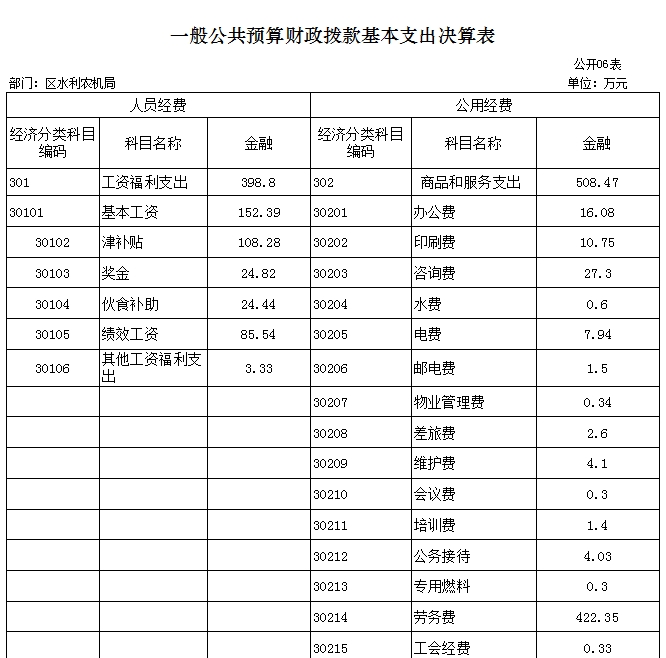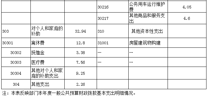 工资福利支出398.8万元,其中基本工资152.39万元、津补贴108.28万元、奖金24.82万元、伙食费24.44万元、绩效工资85.54万元、其他工资福利支出3.33万元。商品和服务支出508.47万元。其中办公费16.08万元、印刷费10.75万元、咨询费27.3万元、水费0.6万元、电费7.94万元、邮电费1.5万元、物业管理费0.34万元、差旅费2.6万元、维护费4.1万元、会议费0.3万元、培训费1.4万元、专用燃料0.3万元、劳务费422.35万元、工会经费0.33万元、其他商品服务支出4.6万元。对个人和家庭的补助32.94万元。其中:退休费12.8万元、抚恤金3.38万元、医疗费7.56万元、其他对个人和家庭的补助9.25万元。其他支出2.26万元。公务用车运行4.05万元、公务接待4.03万元。