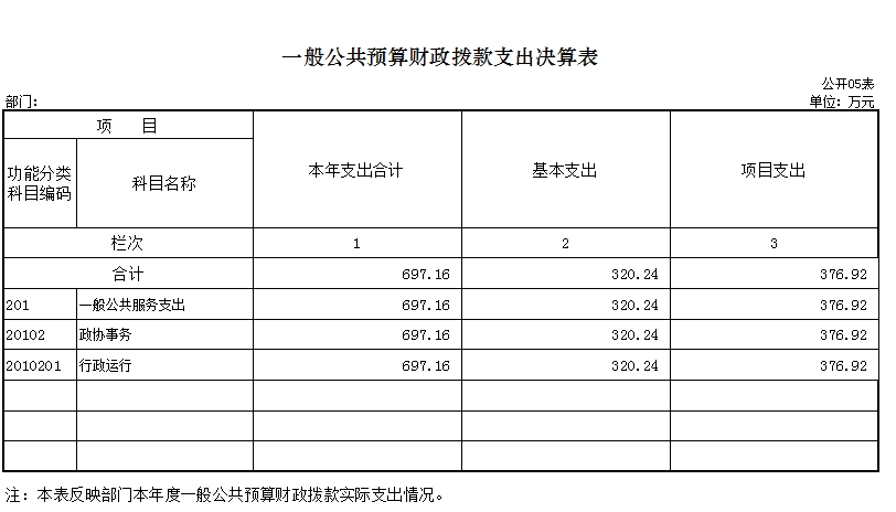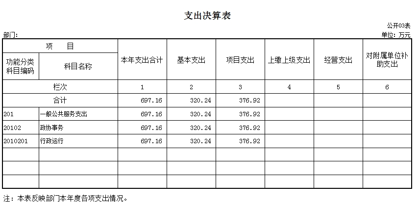 2016年全年总支出为697.2万元,其中:基本支出320.2万元,占总支出45.9%的,项目支出376.9万元占总支出的54.1%。