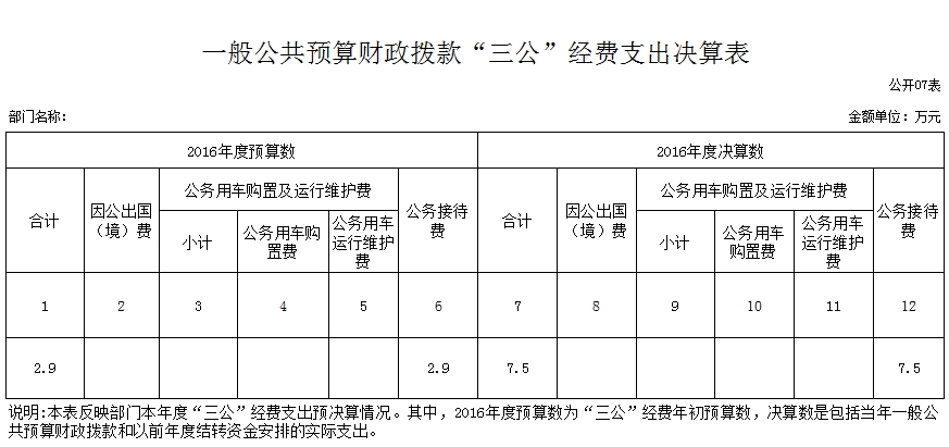 2016“三公”经费总支出为7.5万元,2015年三公经费总支出为3.05万元。对比2015年,2016年“三公”经费减少4.45万元,主要是公务接待费对比2015年增加4.45。