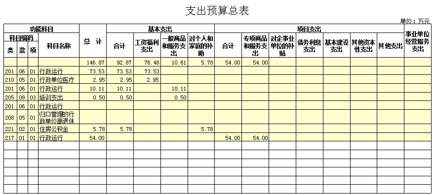 预算总支出146.87万元,其中:基本支出92.87万元(工资福利支出76.48万元、一般商品和服务支出10.61万元、对个人和家庭的补助支出5.78万元);项目支出54万元。