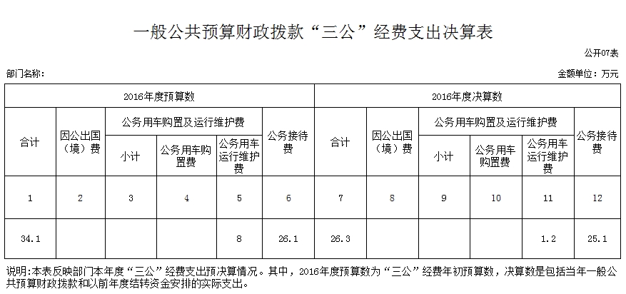 我单位2016年“三公”经费预算安排34.1万元,其中:公务接待费26.1万元,公务用车运行维护费8万元。2016年“三公”实际支出为26.3万元,其中:公务接待费25.1万元,公务用车运行维护费1.2万元。
