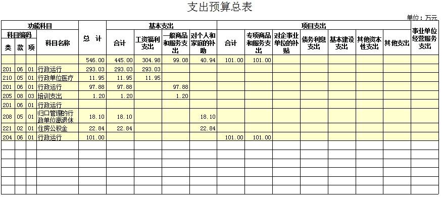 预算总支出546万元,其中:基本支出445万元(工资福利支出304.98万元、一般商品和服务支出99.08万元、对个人和家庭的补助支出40.94万元);项目支出101万元。