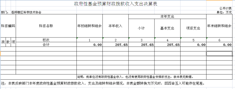 八、关于岳阳楼区科学技术协会单位2019年度政府性基金预算收入支出决算情况