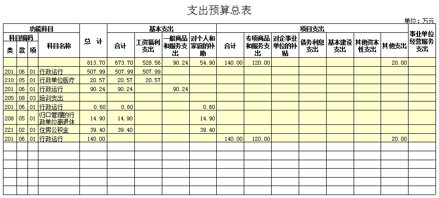 预算总支出813.7万元,其中:基本支出673.7万元(工资福利支出528.56万元、一般商品和服务支出90.24万元、对个人和家庭的补助支出54.9万元);项目支出120万元。非税执收成本20万元。