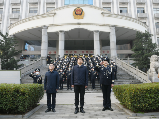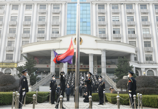 仪式现场,全体民警身着警礼服,整齐列队,精神昂扬。在“升警旗、奏唱警歌”的口令下,中国人民警察警歌嘹亮响起,擎旗手挥臂扬旗,承载着警察荣誉、责任与使命的鲜艳警旗迎着朝阳冉冉升起。