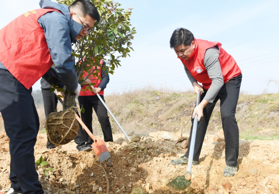 夹着泥土芬芳的春风扑面而来,植树现场一派热火朝天的忙碌景象,大家默契配合、分工协作,以饱满的热情投入到劳动中,或挥锹铲土,或挖坑放苗,或扶苗填土,或踏土夯苗,或灌溉浇水,每道工序一丝不苟、认真细致。经过大家的共同努力,700余株樟树、红叶石楠球等树苗在和煦的春风中傲然挺立,焕发出勃勃生机。