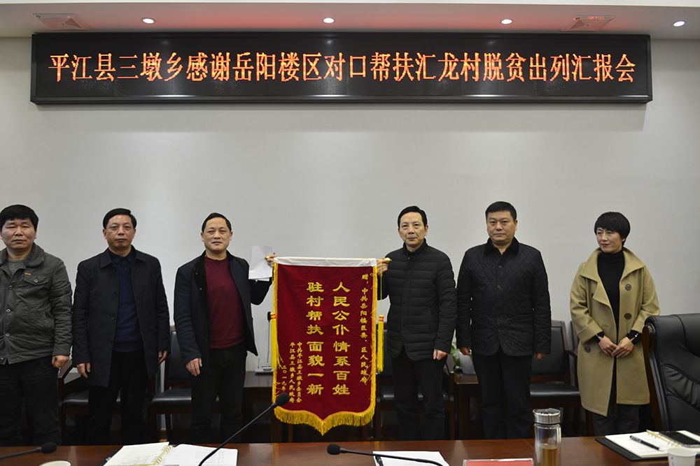 会上,平江县三墩乡党委书记唐杏桂一行四人,为我区送来了印有“人民公仆、情系百姓、驻村帮扶、面貌一新”的锦旗,感谢我区精准帮扶汇龙村脱贫工作的付出与努力。近年来,区委、区政府高度重视汇龙村精准扶贫工作,大力推进异地搬迁、产业项目、基础建设、教育扶贫等各方面工作。汇龙村2018年顺利通过验收,实现了脱贫出列。