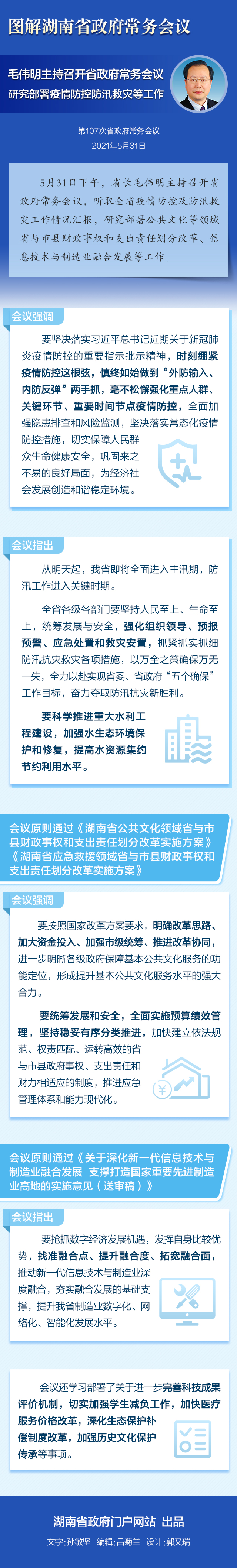 5月31日下午,省长毛伟明主持召开省政府常务会议,听取全省疫情防控及防汛救灾工作情况汇报,研究部署公共文化等领域省与市县财政事权和支出责任划分改革、信息技术与制造业融合发展等工作。