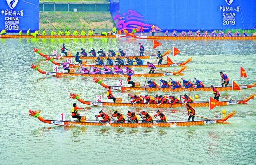 4月20日,参赛队伍在浏阳河长沙市芙蓉区段水域展开角逐。当天,为期两天的2019年中华龙舟大赛(长沙·芙蓉站)鸣锣开赛,来自全国的50支队伍共1130人参加比赛。比赛分职业男子组、职业女子组、精英公开组、青少年男子组、青少年女子组5大组别。 湖南日报记者 李健 摄