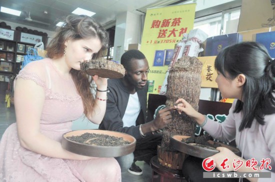 昨日,高桥茶叶市场怡清源门店展台前,一支千两茶茶卷吸引了两名外国客商的眼球。前日,“2019中华茶祖节·湖南春茶展”在高桥茶叶市场神农茶都启动,在昨日“外国客商逛茶展”的主题活动上,上千种各类湘茶吸引无数外国客商品茶购茶。长沙晚报全媒体记者 周辉霞 贺文兵 摄影报道