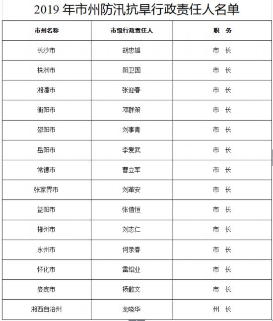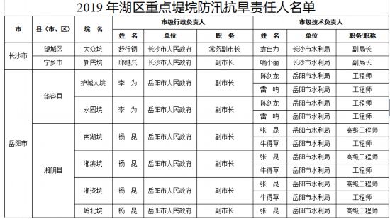 根据《中华人民共和国防洪法》、《中华人民共和国抗旱条例》等有关规定,防汛抗旱工作实行以行政首长负责制为核心的各项防汛抗旱责任制。本次责任人名单公示包括14个市州、14座城市、24座大型水库(水电站)、湖区重点堤垸和蓄洪垸的防汛抗旱责任人。