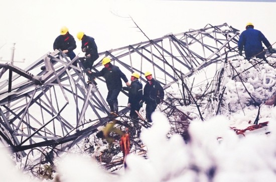 2008 年 2 月,工程人员在湖南省郴州市抢修被冰雪压塌的高压电塔。