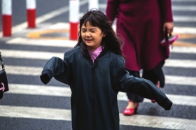 10月6日,长沙市湘江中路和解放西路路口,受冷空气影响,长沙气温持续下降,不少孩子穿上了大人的衣服来保暖。图/实习记者张云峰