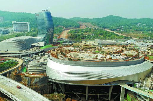 10月9日,长沙湘江欢乐城冰雪世界项目建设工地,工人趁着秋高气爽的好天气加紧施工。目前,该项目整体工程已进入扫尾施工,预计年内开园迎客。该地曾是废弃的深坑,通过生态修复和开发建设并举,将打造成为目前世界上唯一的冰雪与水结合的“两型”主题乐园。(记者 李健 摄)