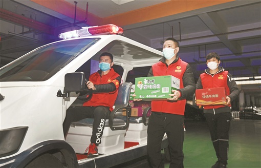2月27日,长沙市开福区湘江世纪城小区,金泰路社区党员志愿者给湘江世纪城居家隔离人员送方便面。该小区是全省最大的居民小区,在当地党组织的坚强领导下,通过群防群治,至今守住了“零确诊”的红线。记者 田超 摄