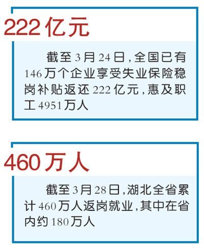 抓住关键点,打出政策“组合拳”,对冲疫情影响。据人力资源和社会保障部发布的信息,截至3月24日,全国已有146万个企业享受失业保险稳岗补贴返还222亿元,惠及职工4951万人。