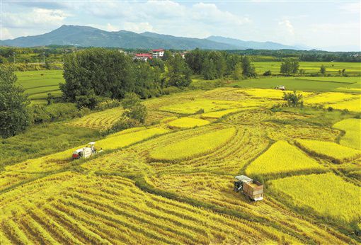 8月7日,资兴市回龙山瑶族乡高坡村,村民驾驶收割机在抢收水稻。当天是立秋节气,当地群众克服干旱缺水等不利因素,积极抢收抢种,力争粮食稳产。