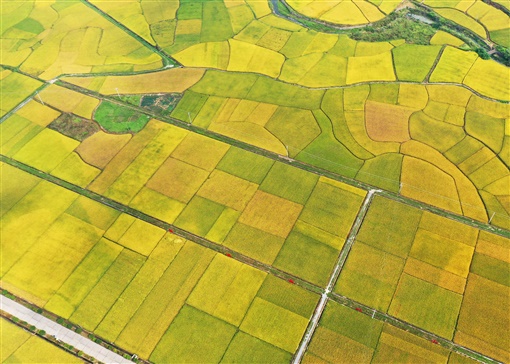 10月10日,嘉禾县普满乡,稻田一片金黄。近日,该乡连片1.4万亩优质水稻陆续成熟,迎来收获期,金黄色的稻田与村庄相互辉映,构成一幅幅如诗如画的美丽画卷。黄春涛 摄