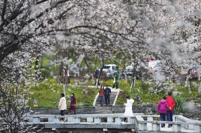 2月17日,天气转好,游客在长沙市望月公园铜盆湖畔观赏樱花。该公园种植的山樱树正值花季,一朵朵樱花迎风绽放,白色的花瓣在阳光映照下就像漫天飞雪,吸引了不少游客。 记者 田超 摄