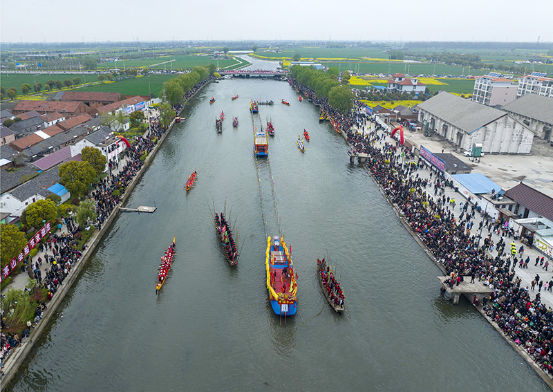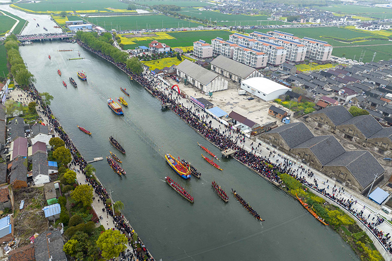 4月5日,各式船只在茅山西大河参加茅山会船(无人机照片)。