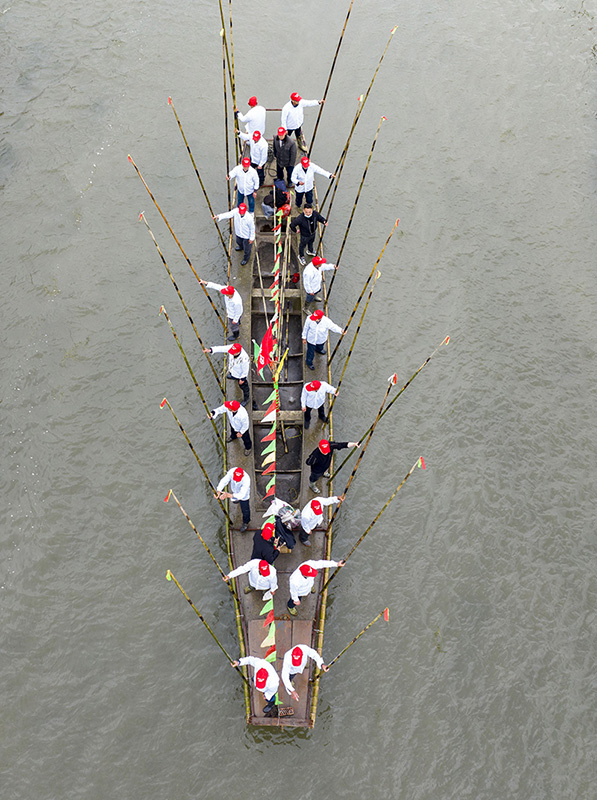 4月5日,选手驾船在茅山西大河参加茅山会船(无人机照片)。