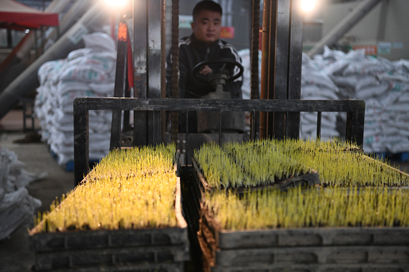 4月6日,在江西省南昌县蒋巷镇大田农社育秧生产车间,工人驾驶叉车转运暗化催芽好的秧苗。