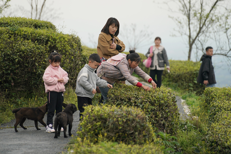 4月5日,在汉中市南郑区牟家坝镇的茶园,游客跟随茶农学习采茶。