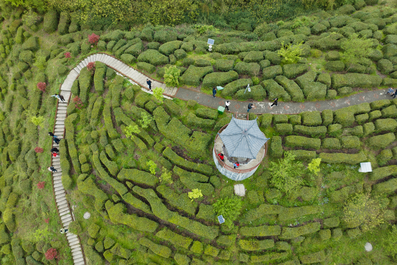 4月5日,游客在汉中市南郑区牟家坝镇的茶山上游玩(无人机照片)。