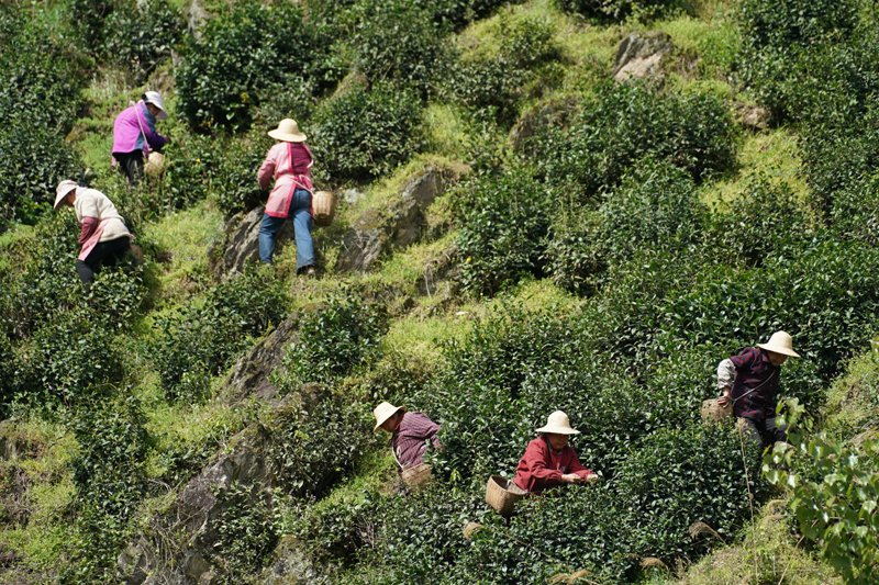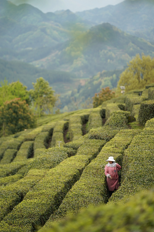 4月6日,茶农在安康市紫阳县焕古镇的茶山上采茶。