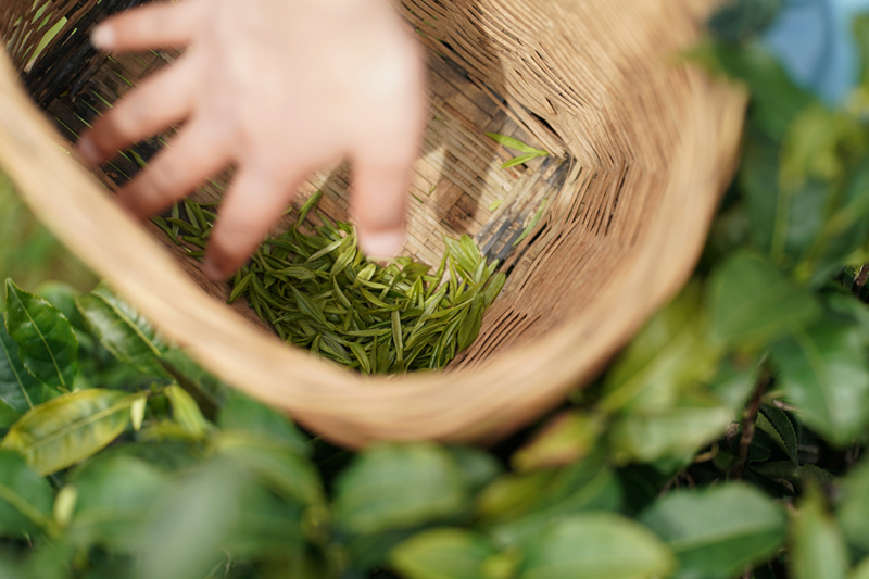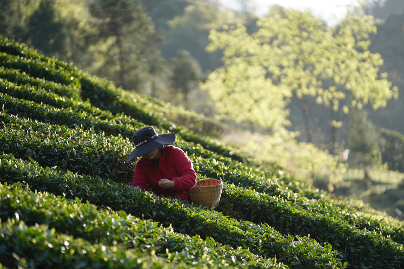 4月5日,茶农在汉中市南郑区牟家坝镇一处茶园采摘茶叶。