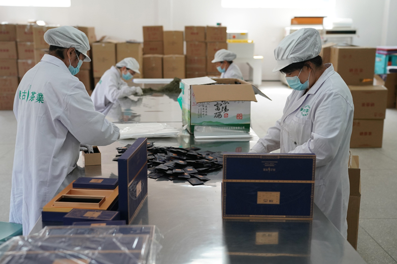 4月6日,工人在安康市紫阳县焕古镇一家茶企车间包装茶产品。