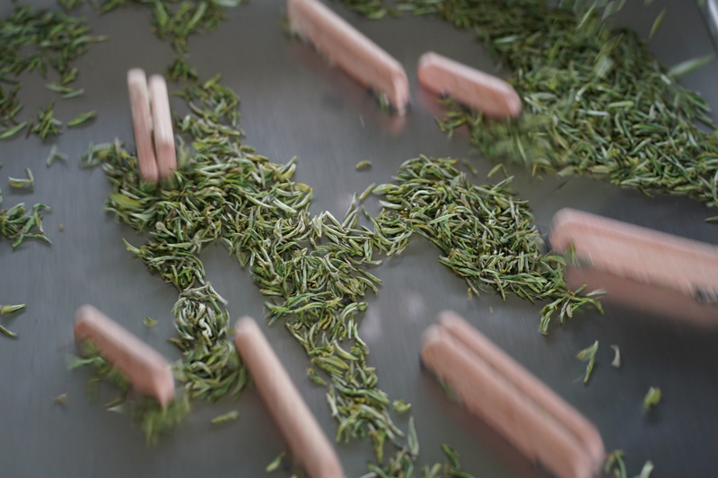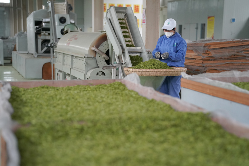 汉中市南郑区青树镇一家茶企生产线上加工的茶叶(4月5日摄)。