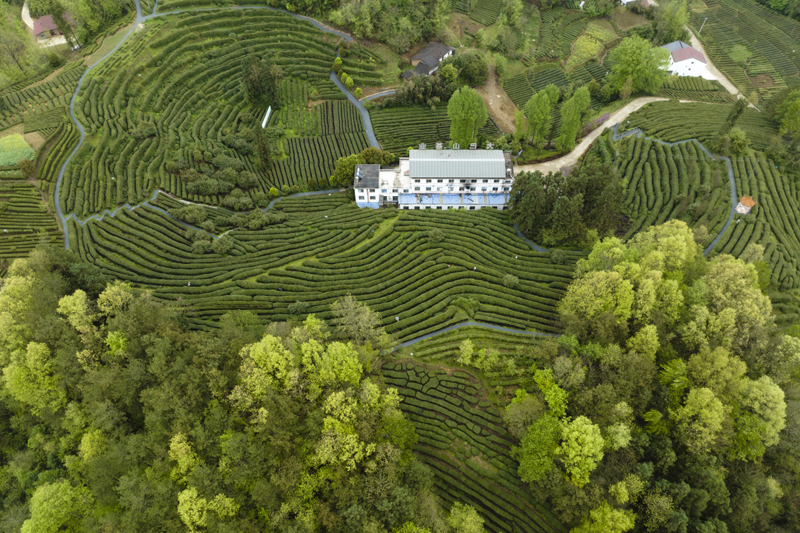 汉中市西乡县峡口镇茶园茶厂景色(4月4日摄,无人机照片)。
