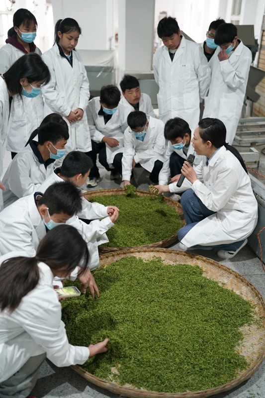 3月29日,安康市紫阳县职业教育中心茶叶专业的学生在该县一家茶厂学习茶叶鲜叶的干燥工艺。