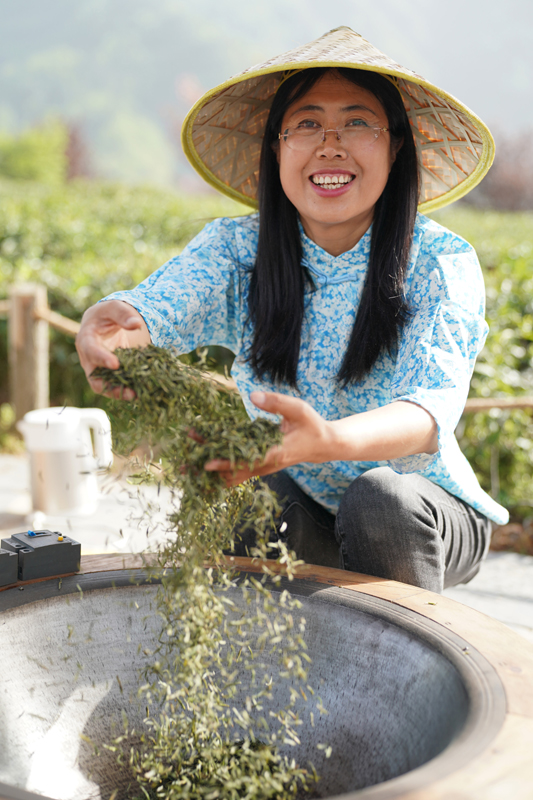 4月6日,游客在安康市紫阳县向阳镇一处茶园体验炒茶。