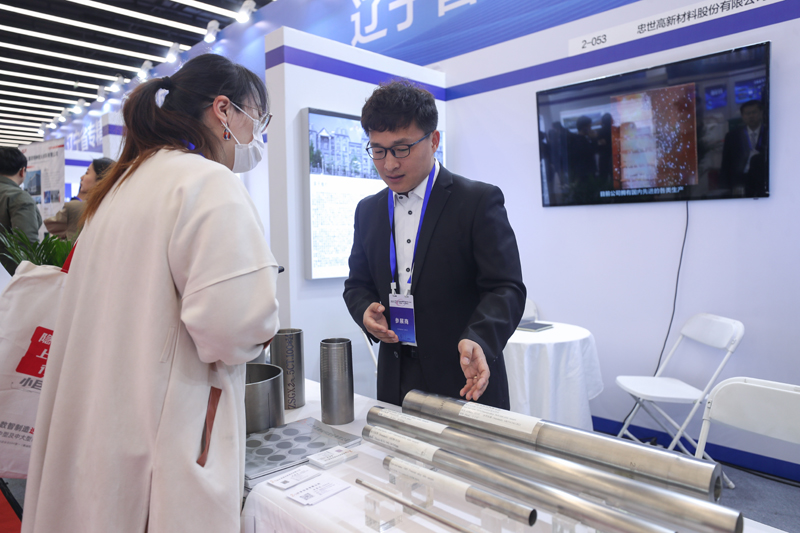 4月8日,参展商在2023中国中小企业发展大会“专精特新”中小企业展览会上向观众介绍产品。