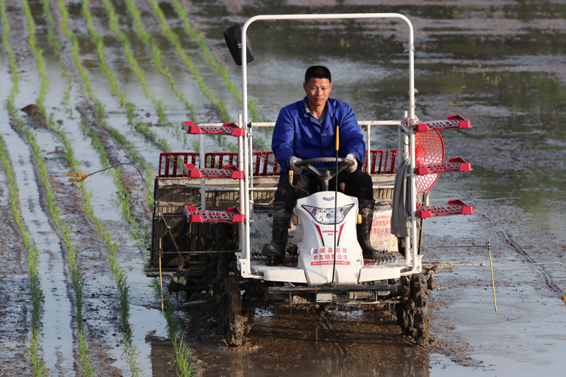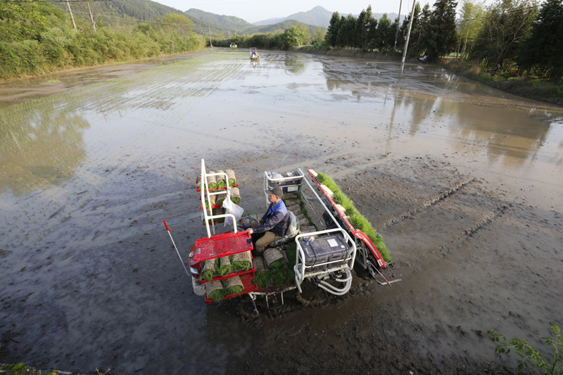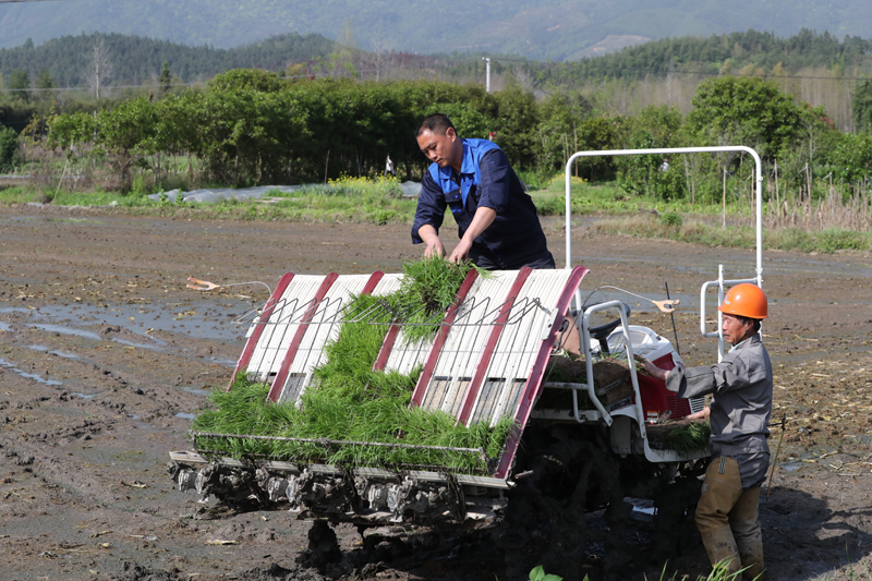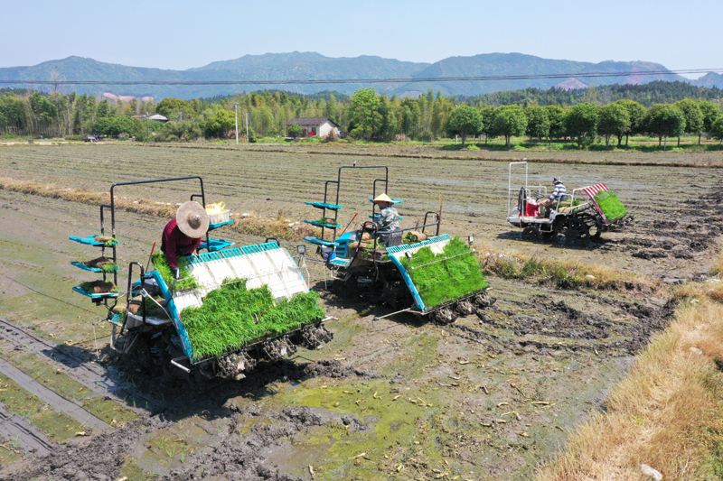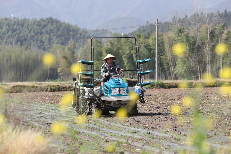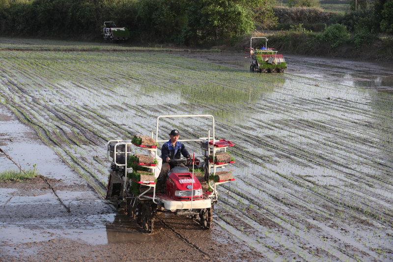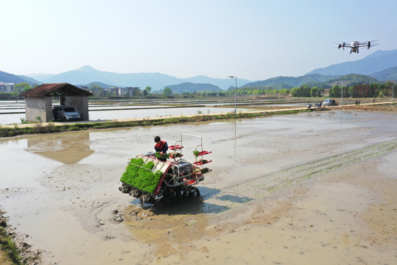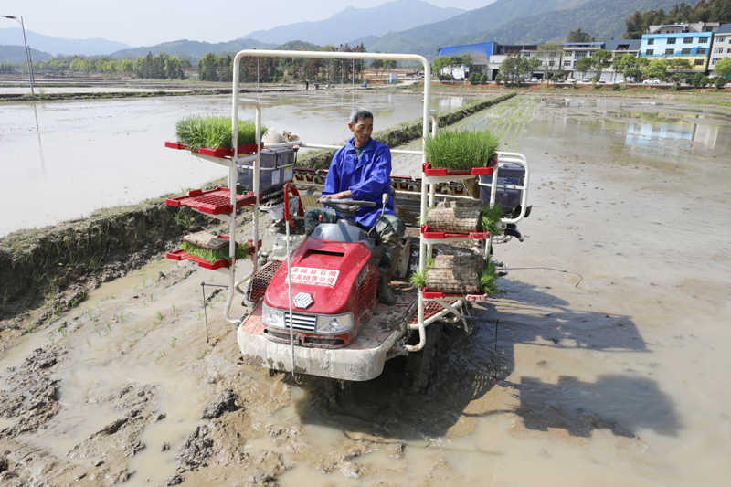 4月8日,在浦城县石陂镇高标准农田,农民驾驶插秧机开展再生稻插秧作业。