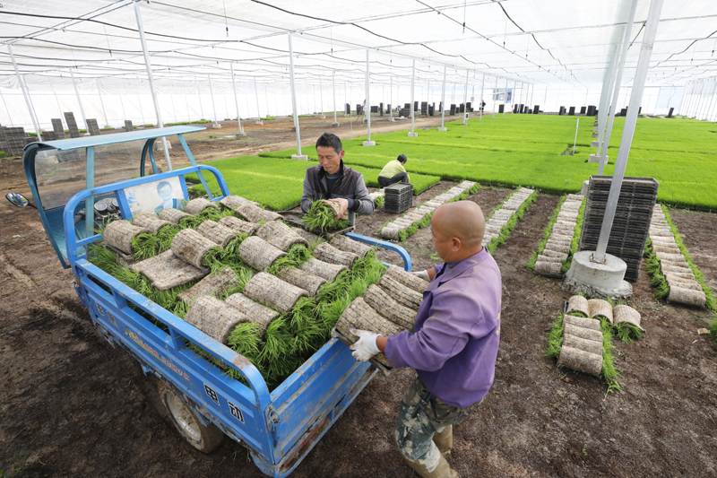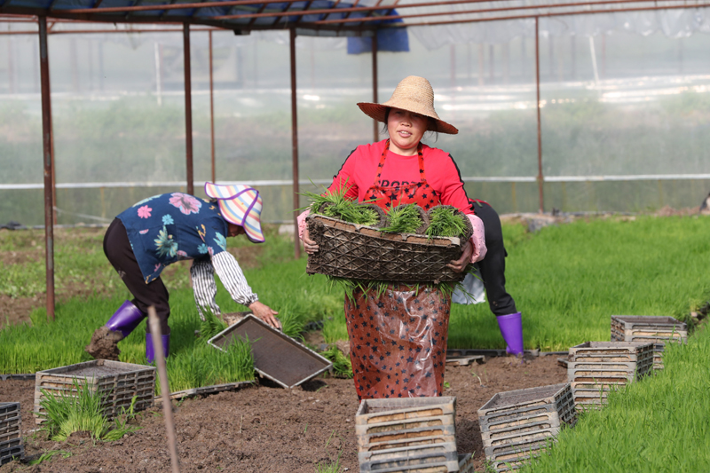4月7日,浦城县临江镇万鑫家庭农场工人在育苗大棚里搬运再生稻秧苗。