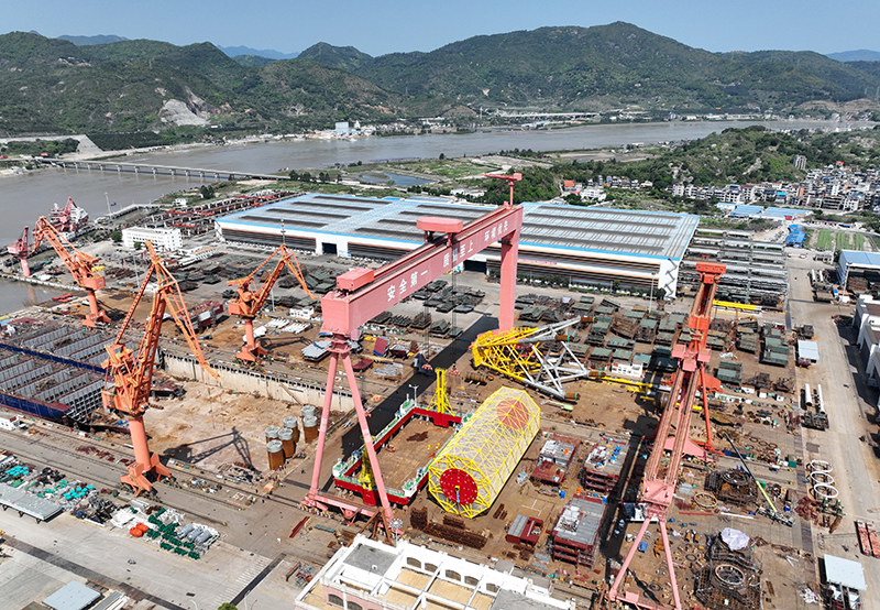 4月9日在马尾造船股份有限公司总组场地拍摄的“乾动2号”深远海养殖平台(无人机照片)。