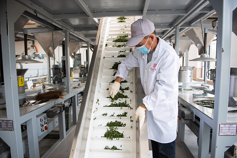 4月11日,在长沙望城乌山贡茶基地,工人抽查茶叶品质。