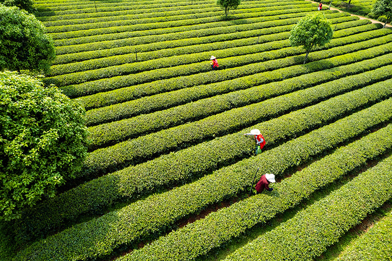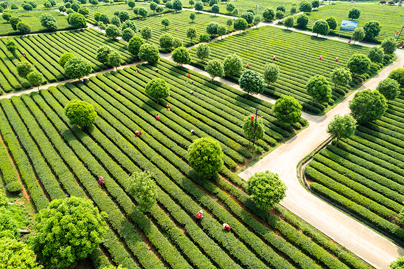 4月11日,在长沙望城乌山贡茶基地,茶农采摘春茶(无人机照片)。