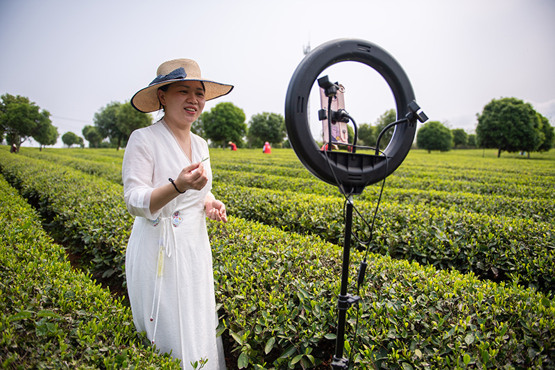 4月11日,在长沙望城乌山贡茶基地,工作人员通过直播推销茶叶。