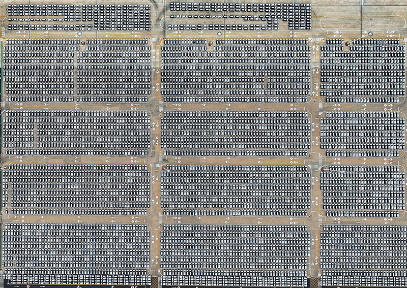在天津港海嘉滚装码头,汽车排列整齐,等待装船(4月10日摄,无人机照片)。